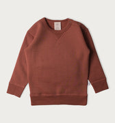 I am delighted with the sweatshirt. It’s a great shape and decent length, so my Grandson’s middle stays warm too. Not too thick or thin. A good weight for most of the year round. The domes on the shoulder are a great idea for making it easy to put on and take off - happy baby. The colour is rich and the whole product is beautiful quality, with double stitching for durability. I bought one size up and when you roll the sleeves over the cuffs look great and stay in place. It washed really well in the machine on a wool setting using wool wash. No shrinkage.