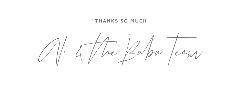 You’ll find Ali’s love of simple design and superb, multi-generational quality in every Babu Basics product. And her love of family is part of everything here too. It’s in the way we make our products, the way we pack your orders with a handwritten note, even in the way every soft toy gets a hug before we ship it to you.